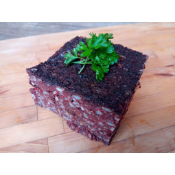 Bohatá a sytá chuť: Základem je pečlivě vybrané vepřové maso, vepřová krev, mleté škvarky, kroupy a smažená cibulka.